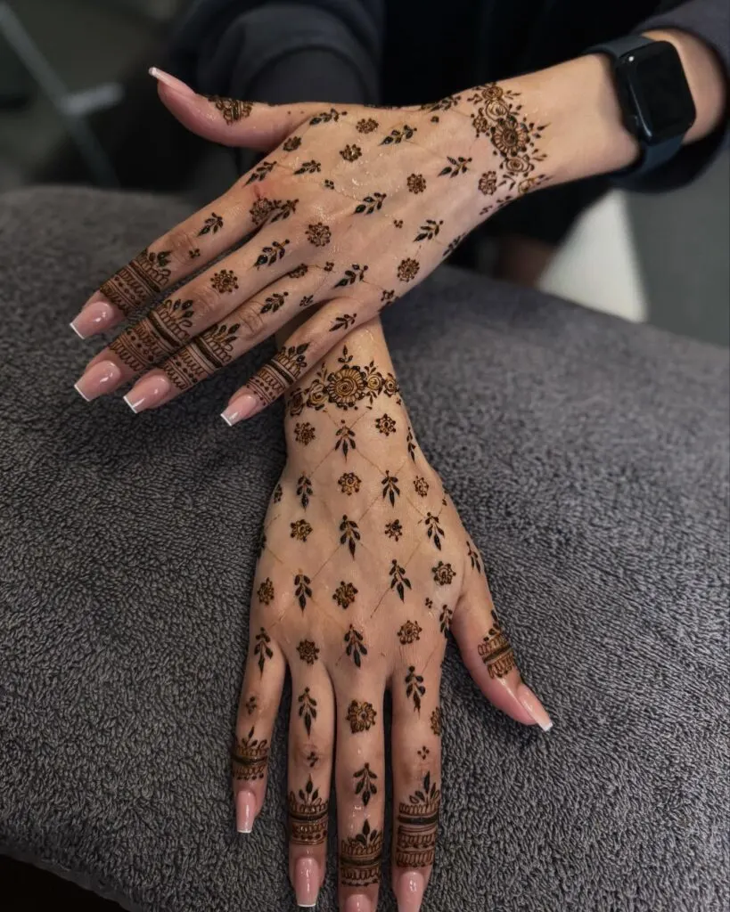 This henna tattoo features a charming polka dot effect created with tiny floral motifs and leafy details across the hands.