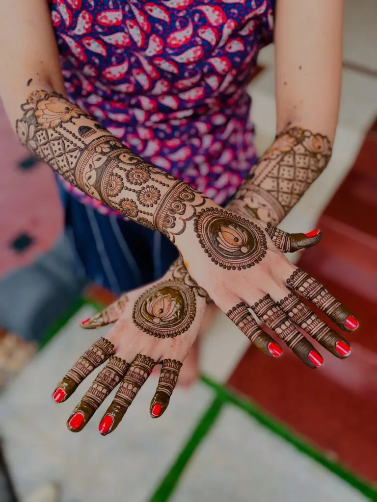 This henna tattoo is a stunning full-arm design featuring bold mandalas at the center of the palms, symbolizing balance and beauty.