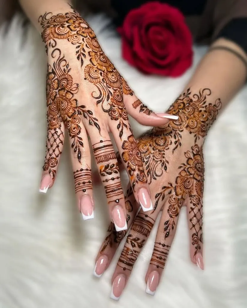 This design focuses on fullness rather than intricate patterns, making it perfect for those who prefer statement pieces. With its lifelike floral artistry, it combines timeless beauty and modern henna style, offering a sophisticated and romantic touch.