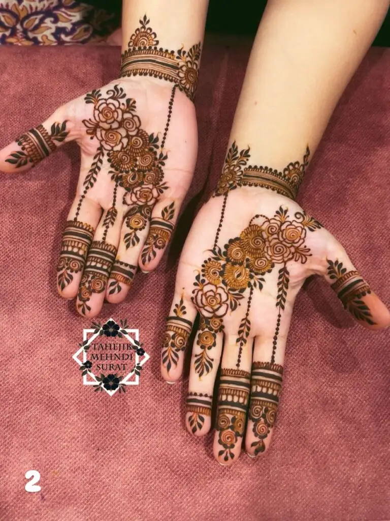 The cascading placement emphasizes movement, making the hand appear elegant and elongated. This design is ideal for festive occasions, combining classic floral elements with intricate details that bring both beauty and sophistication to the palm.
