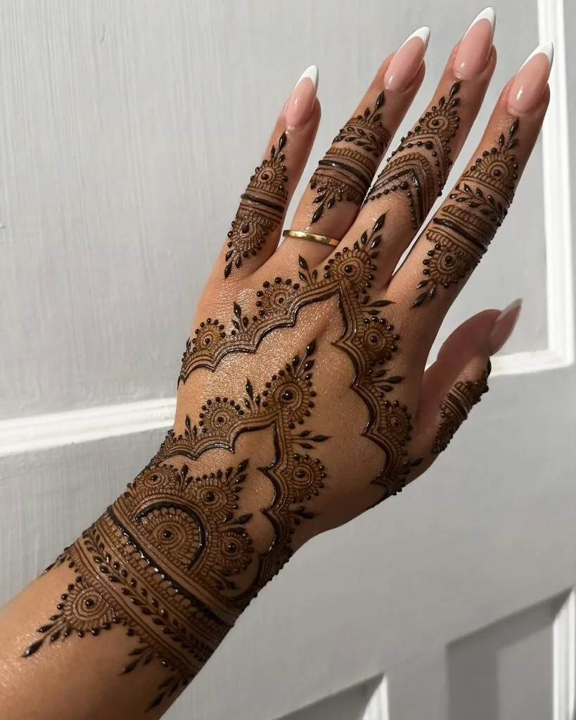 With its lace-like charm and fine artistry, this henna design beautifully enhances elegance while symbolizing femininity and tradition.