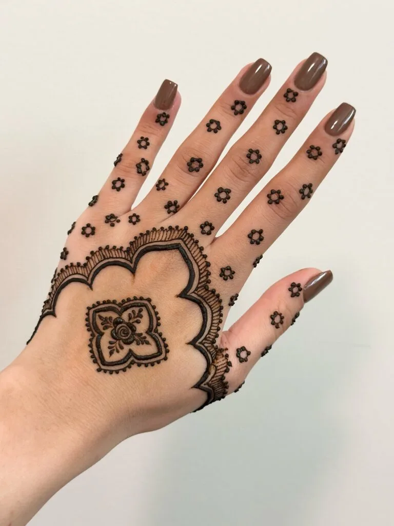 This henna tattoo design beautifully combines geometric balance with delicate floral accents. The centerpiece features a square frame filled with a bold floral motif, symbolizing harmony and growth.