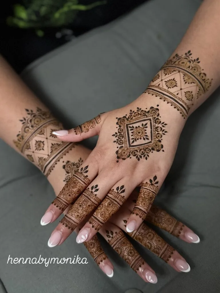 This henna tattoo blends traditional mandala art with structured geometric cuff patterns on the wrist. The mandala on the back of the hand radiates symmetry, while the bold wrist cuff adds striking detail.