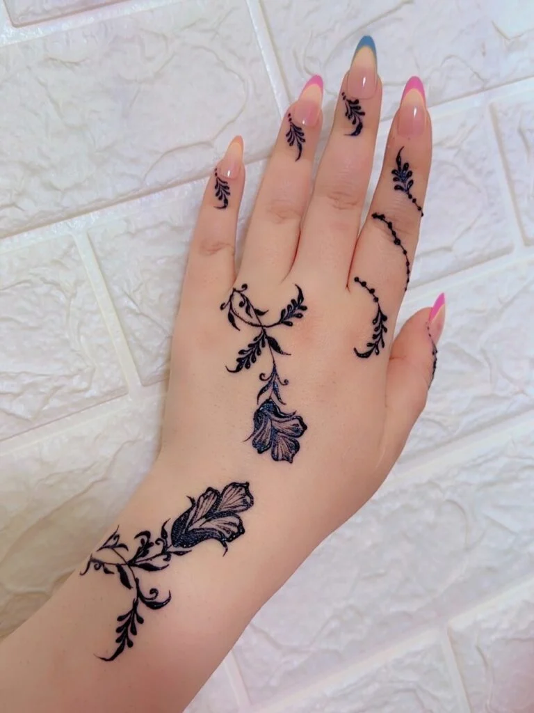 This henna tattoo embraces minimal beauty with delicate floral vines spread across the hand and fingers.
