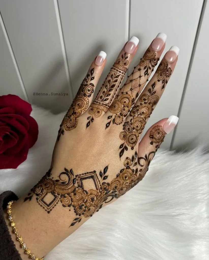 Circular floral motifs flow across the hand, connected by leafy trails that enhance movement and symmetry. Unique geometric shapes near the wrist add structure, giving the design a contemporary touch.