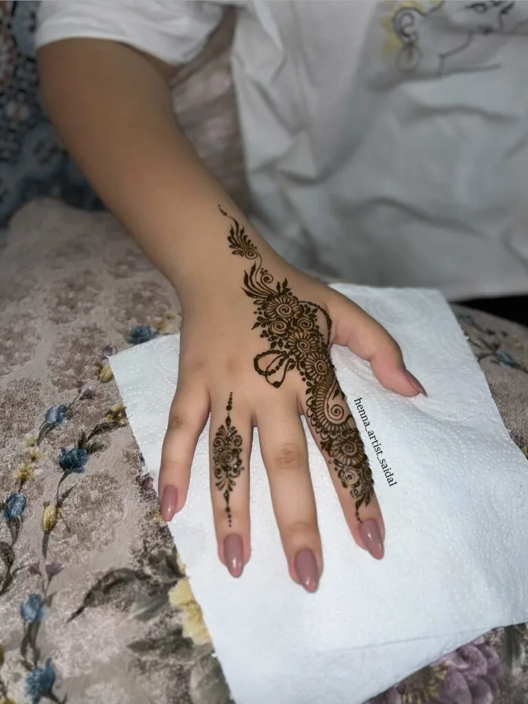 This henna look is perfect for someone seeking subtle beauty with graceful detailing that highlights the natural charm of the hand.