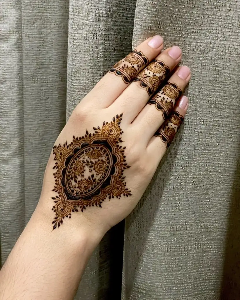 Finger patterns remain light, with leafy accents and minimal details to balance the heavier central motif. Perfect for festive occasions or traditional events, this design combines bold artistry with timeless henna elegance.