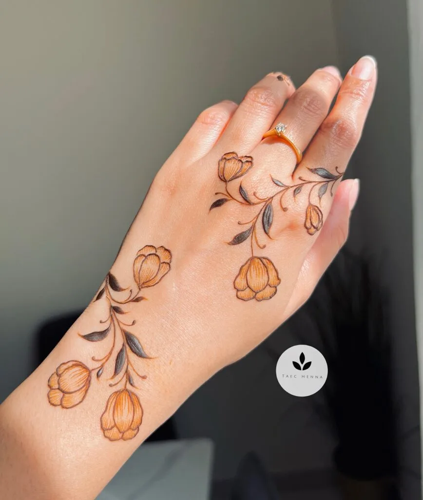 This henna tattoo features a graceful vine winding along the hand, accented by delicate blossoms and curved leaves.