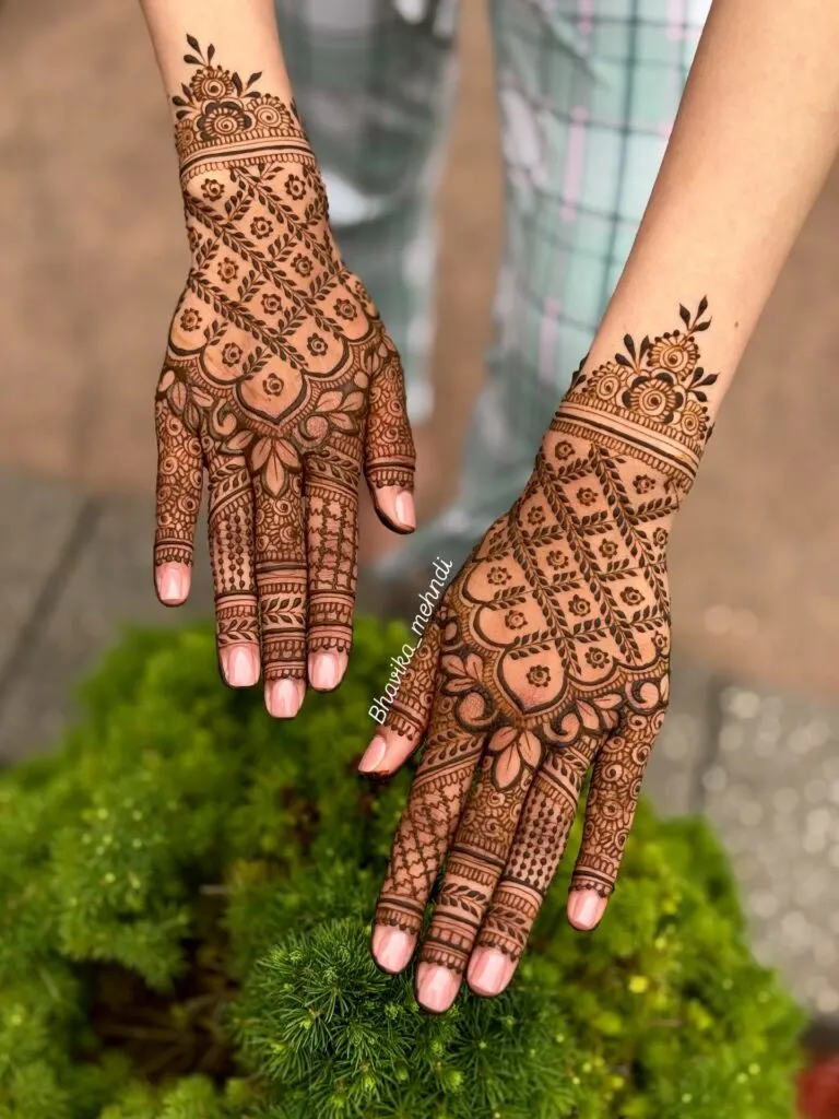 The wrists showcase ornamental cuffs with floral and geometric details, framing the overall layout beautifully. Ideal for weddings and festivals, this traditional style symbolizes harmony and artistry while making the hands look elegant and festive.