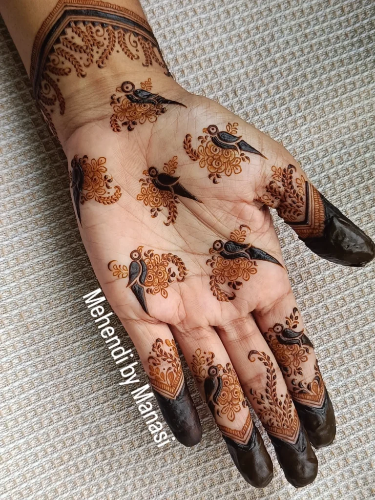 This henna tattoo stands out with its creative use of bird motifs perched atop floral bases across the palm.