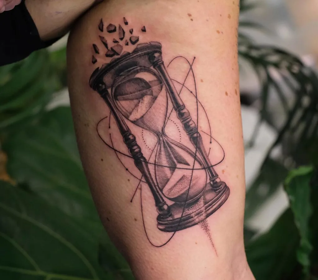 This bold bicep tattoo features a realistic hourglass tilted at a dramatic angle, encircled by fine, orbiting lines that add a dynamic feel. Above the glass, shattered fragments break away, suggesting time breaking free.