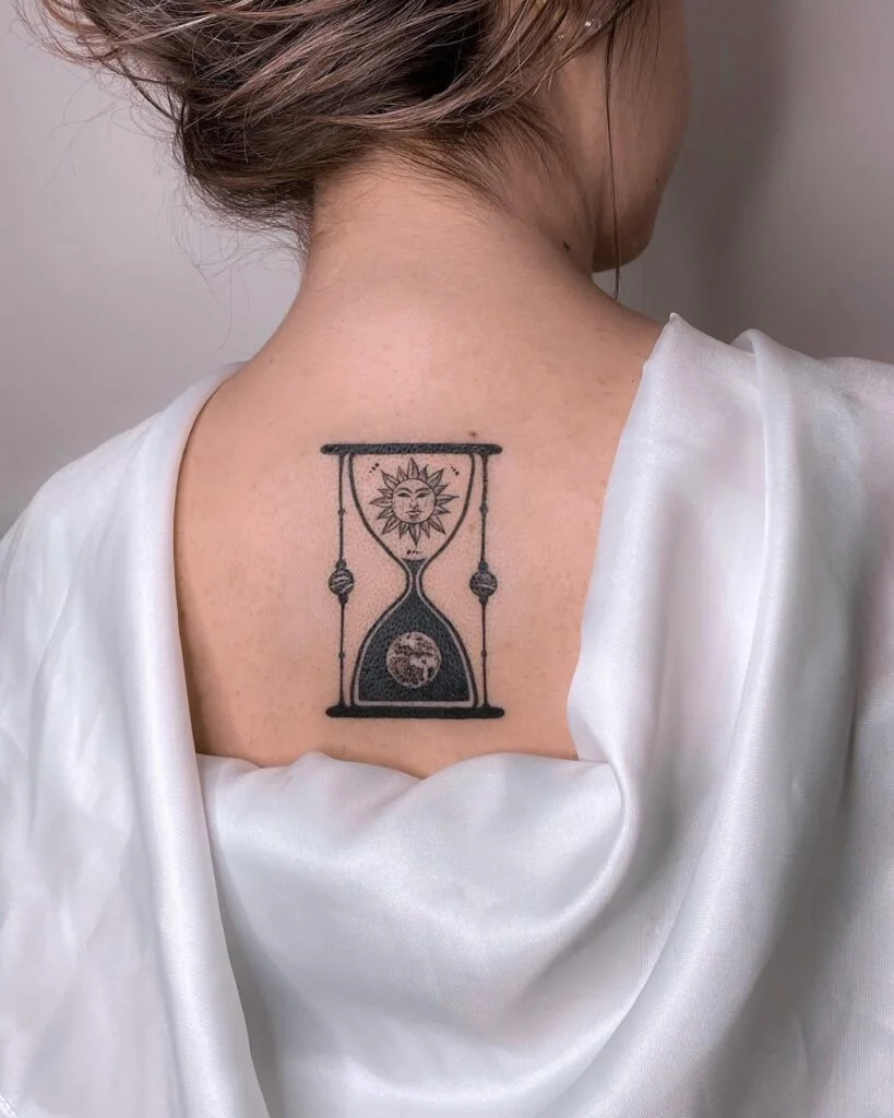 This stunning hourglass tattoo on the upper back blends time and the universe into one powerful design. The top half holds a radiant sun with a gentle face, while the bottom contains a detailed moon surrounded by starry skies.