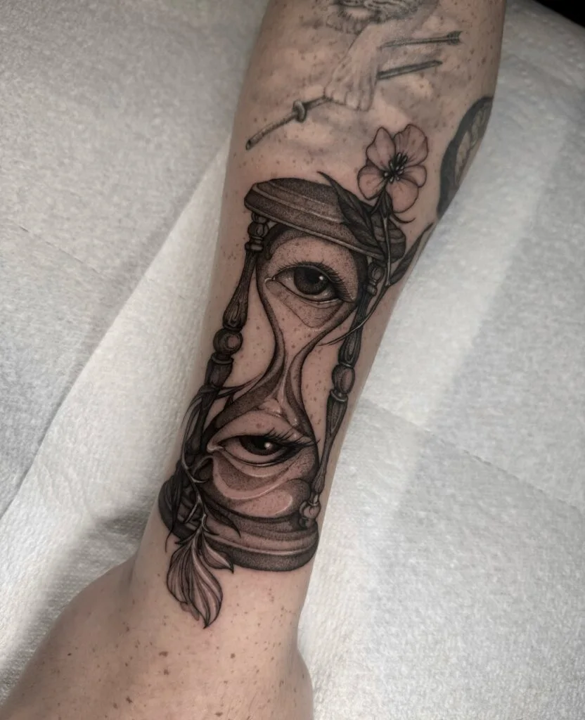 This captivating tattoo shows a finely detailed hourglass containing a surreal face that bends with the flow of time. Eyes gaze from the top section as lips form in the bottom, merging seamlessly as grains of sand slip through the center.