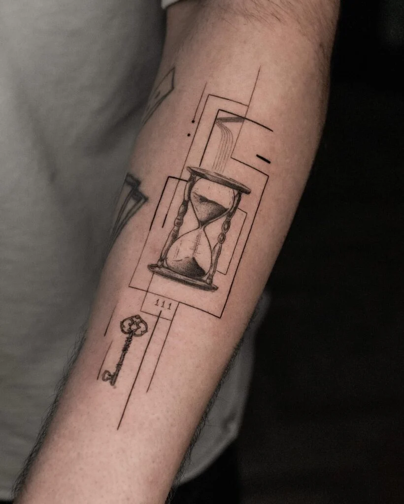This detailed forearm tattoo features a classic hourglass centered within fine geometric lines that add structure and balance. Beneath it, an ornate key points toward the number “111,” representing new beginnings and alignment on one’s path.