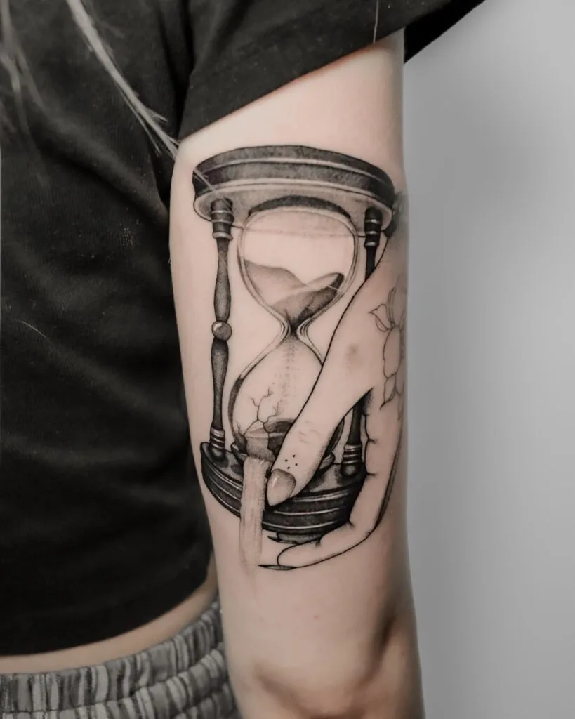 Smooth shading and fine-line work enhance the 3D effect, making the glass and fingers look remarkably realistic. Its placement on the upper arm adds impact and a sense of strength. This design is a powerful visual reminder that time is fragile — and can slip away at any moment.