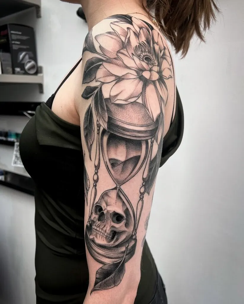 Hourglass and Skull Half-Sleeve Tattoo with Flowers