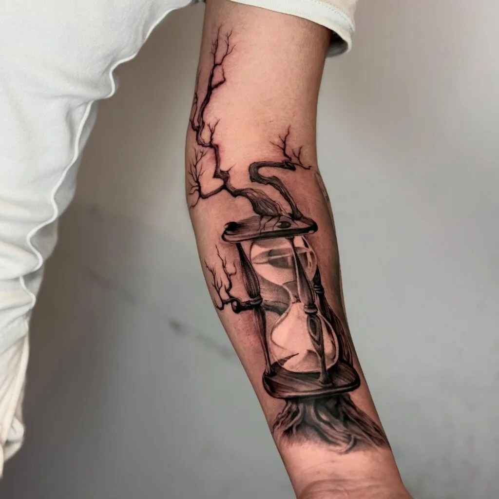 Above and below, jagged tree branches grow into and around the hourglass, suggesting themes of time intertwined with nature and resilience. Placed along the forearm, the design stretches gracefully across the skin. Its intricate details and smooth shading make this piece feel alive, perfect for someone who appreciates symbolism and striking, organic art.