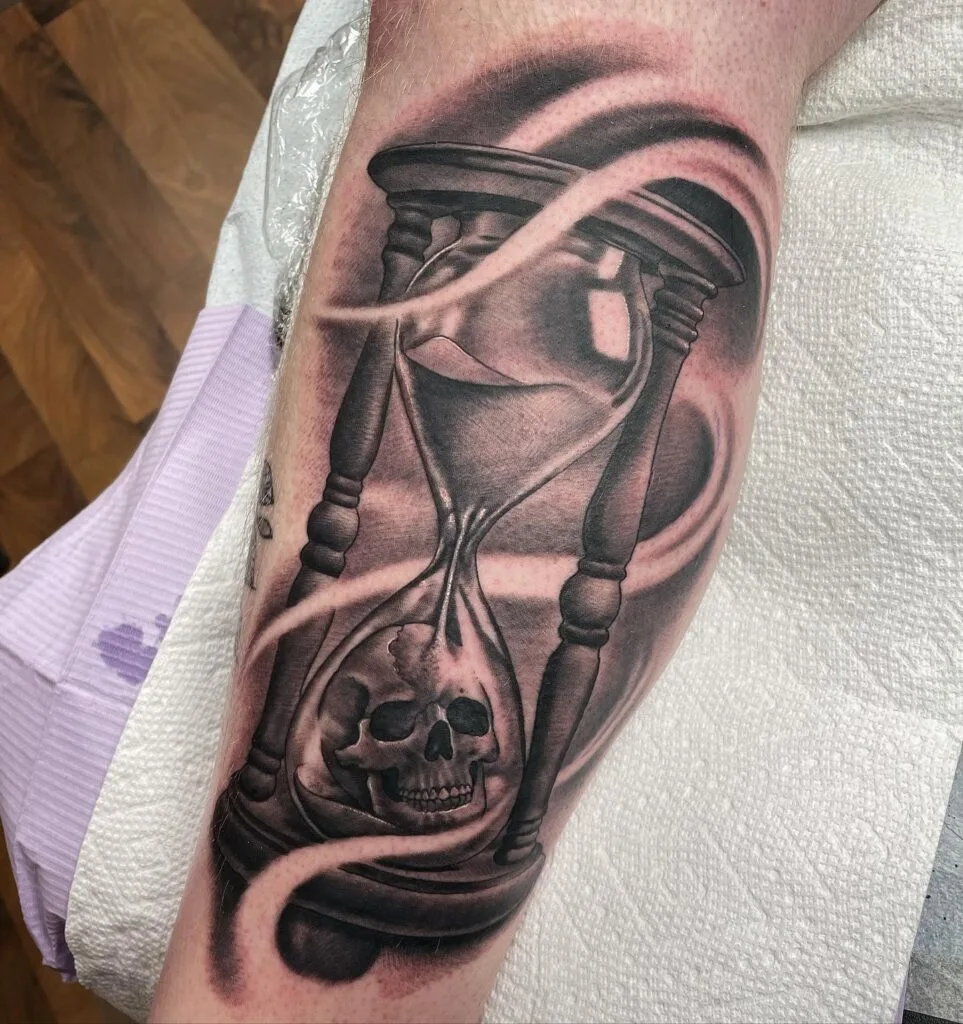 This powerful black-and-grey tattoo features a bold hourglass with a realistic skull settled in its base. Soft swirling lines wrap around the glass, creating a sense of motion and mystery.