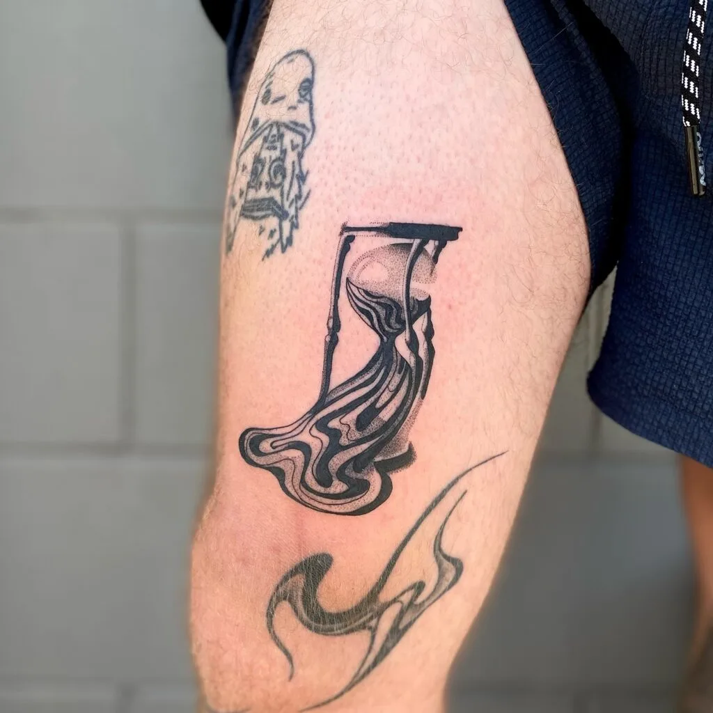 This bold hourglass tattoo on the thigh features a unique surrealist design where the sands seem to melt into liquid waves. Thick black lines contrast with soft dotwork shading inside the hourglass, creating depth and flow.