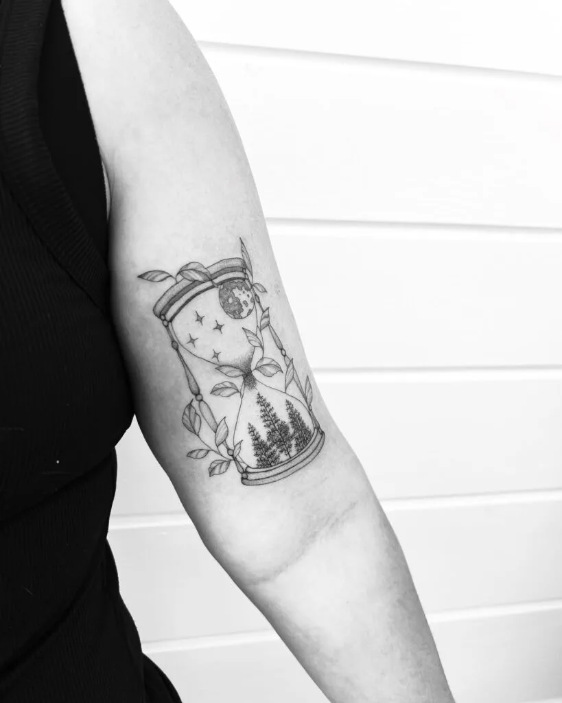 This enchanting hourglass tattoo on the upper arm is filled with symbolic elements of nature. Inside the glass, a dense forest of tall winter trees rises up from a bed of tiny leaves. Above, the Southern Cross constellation and a detailed moon illuminate the sky, creating a sense of quiet wonder.