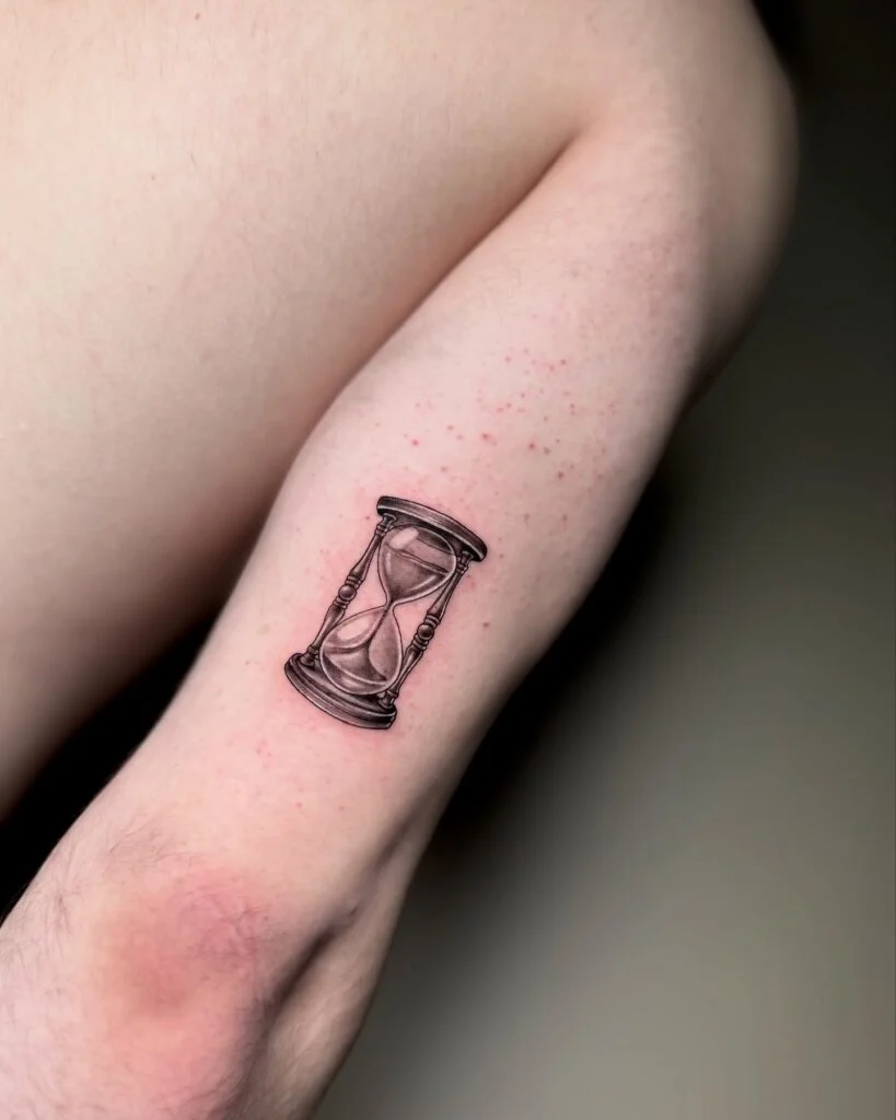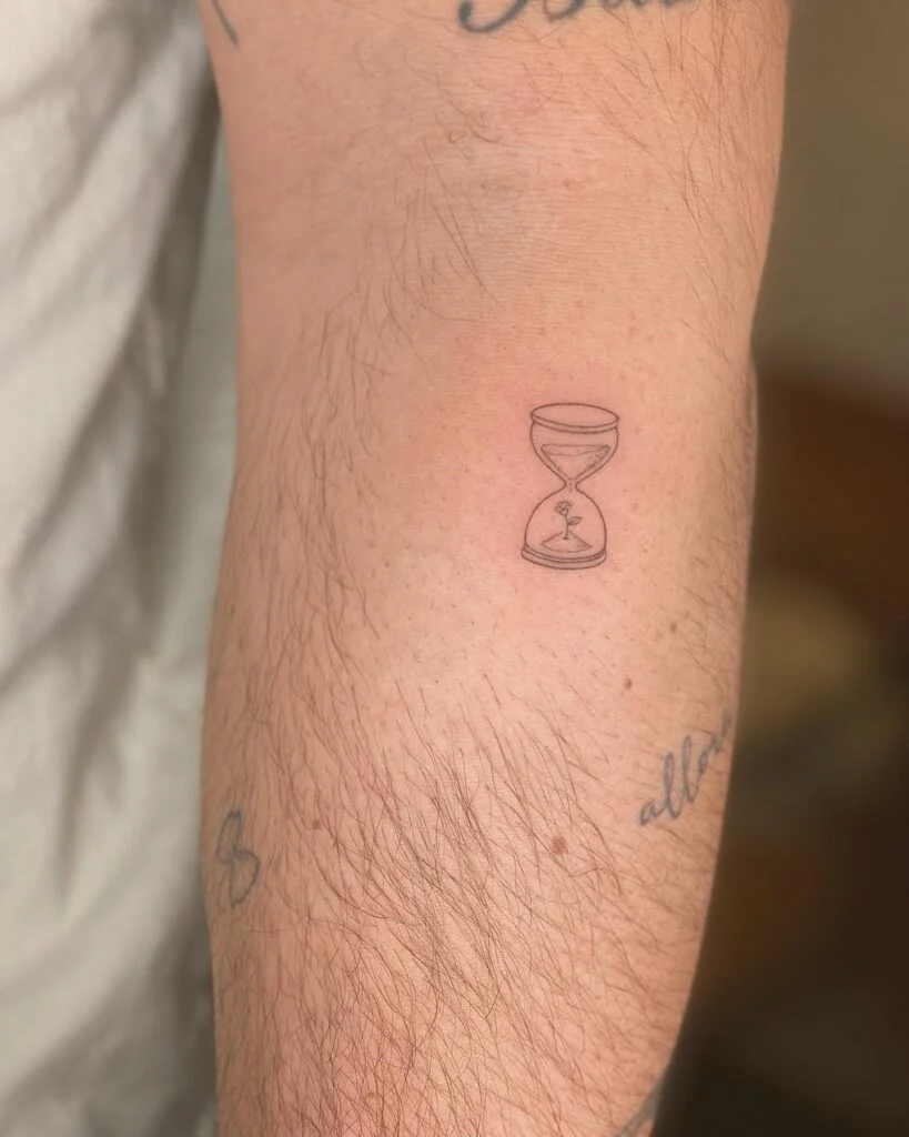 This delicate hourglass tattoo placed just above the elbow features a minimalist design with fine, clean lines. Within the bottom chamber, a tiny flower grows, symbolizing life and growth flourishing despite time’s passing sands.
