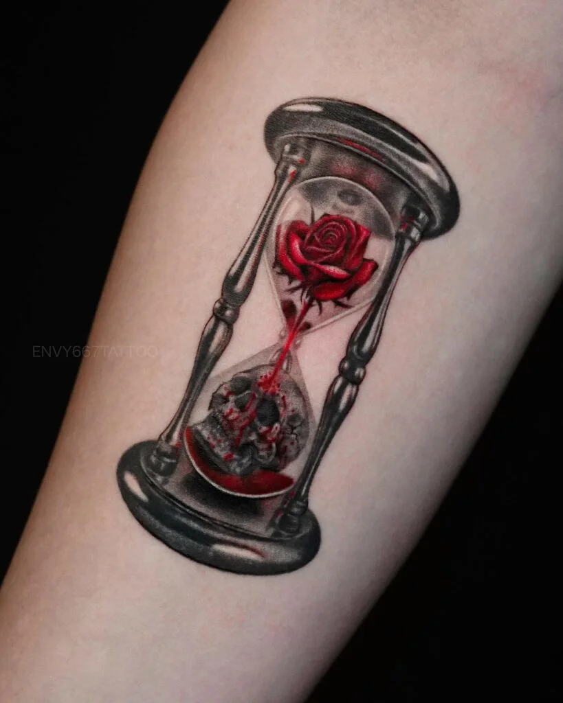 This striking hourglass tattoo on the arm blends beauty and mortality with vivid detail. A bright red rose blooms inside the top chamber, its petals seeming to drip like blood into the bottom. The bottom chamber is filled with a dark, realistic skull, creating a bold contrast.
