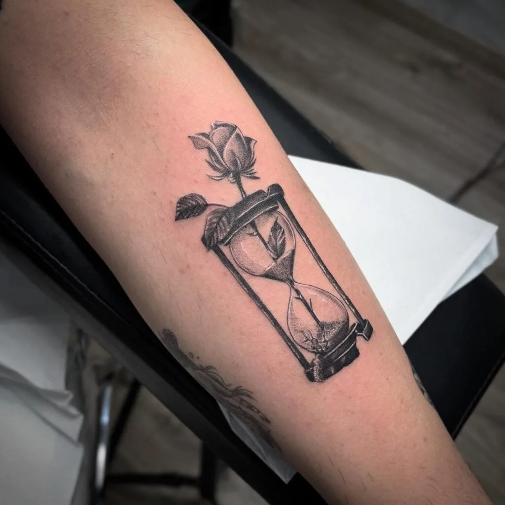This elegant black-and-grey tattoo features a timeless hourglass intertwined with a delicate rose. The rose blooms gracefully at the top of the hourglass, its leaves and petals softly wrapping around the frame.