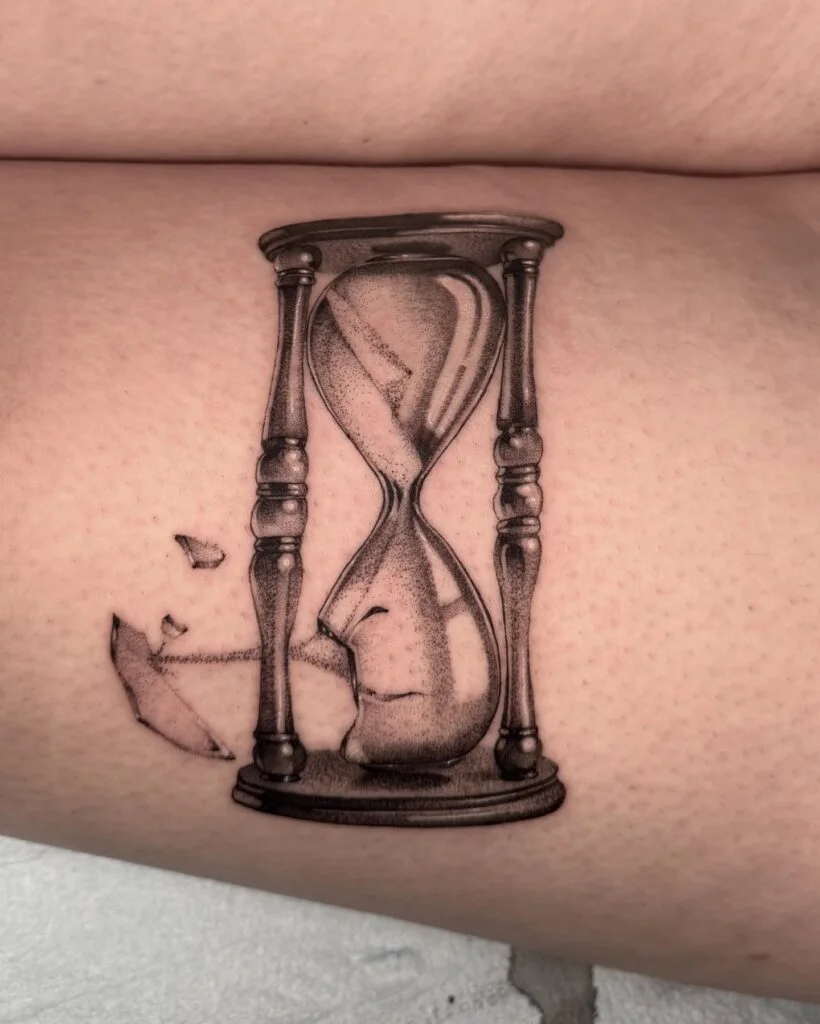 Smooth black-and-grey shading and dotwork accentuate the contours, making the glass look three-dimensional. Positioned on the inner bicep, the tattoo perfectly complements the muscle’s shape. This design is a powerful visual representation of time’s fragile nature — it can slip away or shatter at any moment.