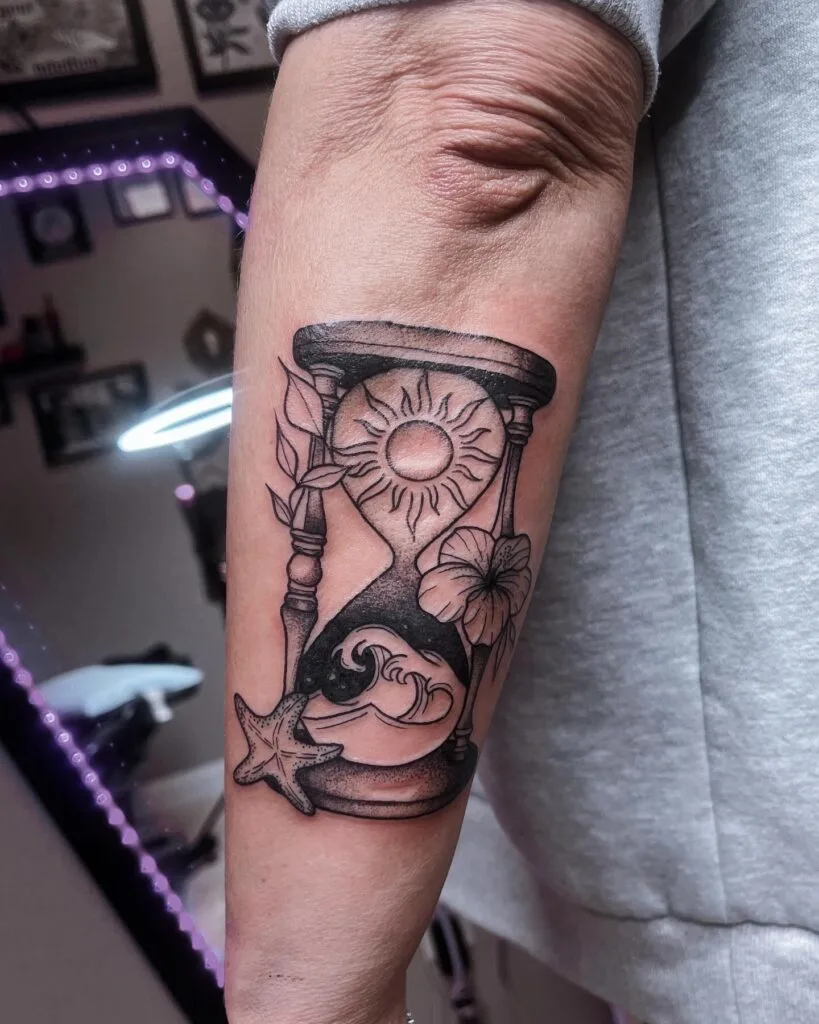 This beautiful hourglass tattoo blends elements of nature and time seamlessly. A radiant sun glows at the top, with gentle ocean waves inside the bottom half, symbolizing the peaceful rhythm of life.