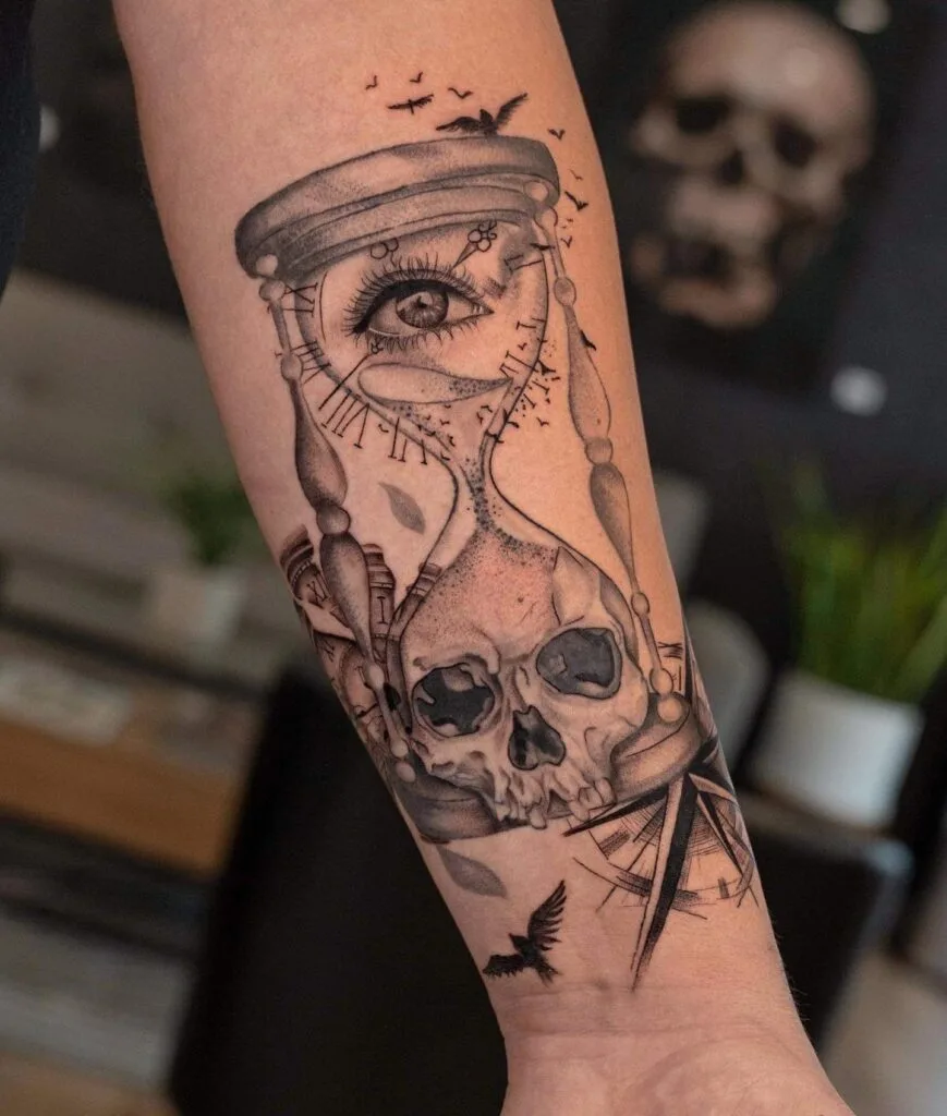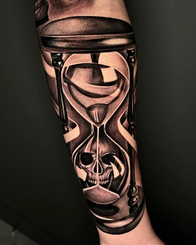 Dark Hourglass and Skull Forearm Tattoo