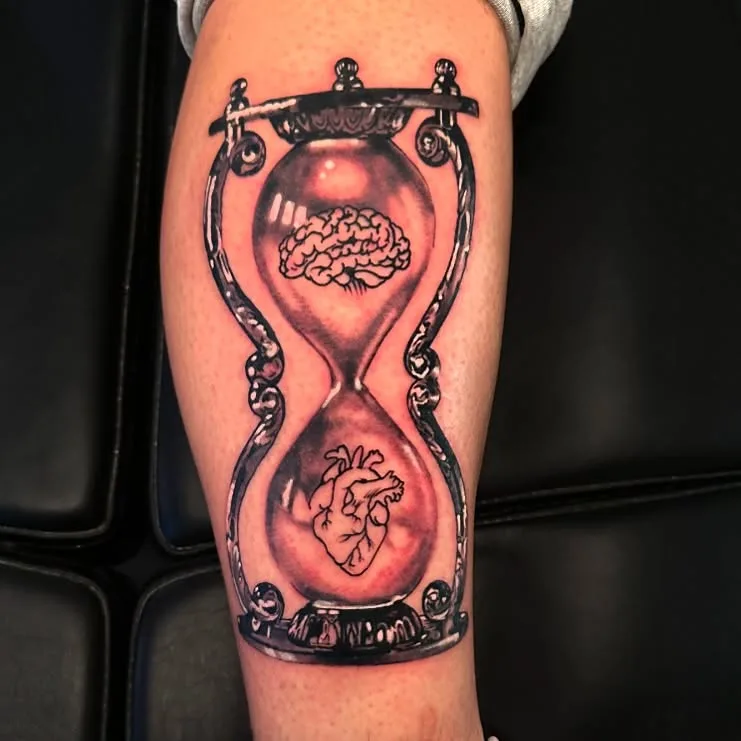This powerful tattoo depicts an intricately detailed hourglass with a brain in the top and an anatomical heart in the bottom. Rendered in crisp black and gray ink, the hourglass symbolizes the passage of time and the delicate balance between thought and emotion.