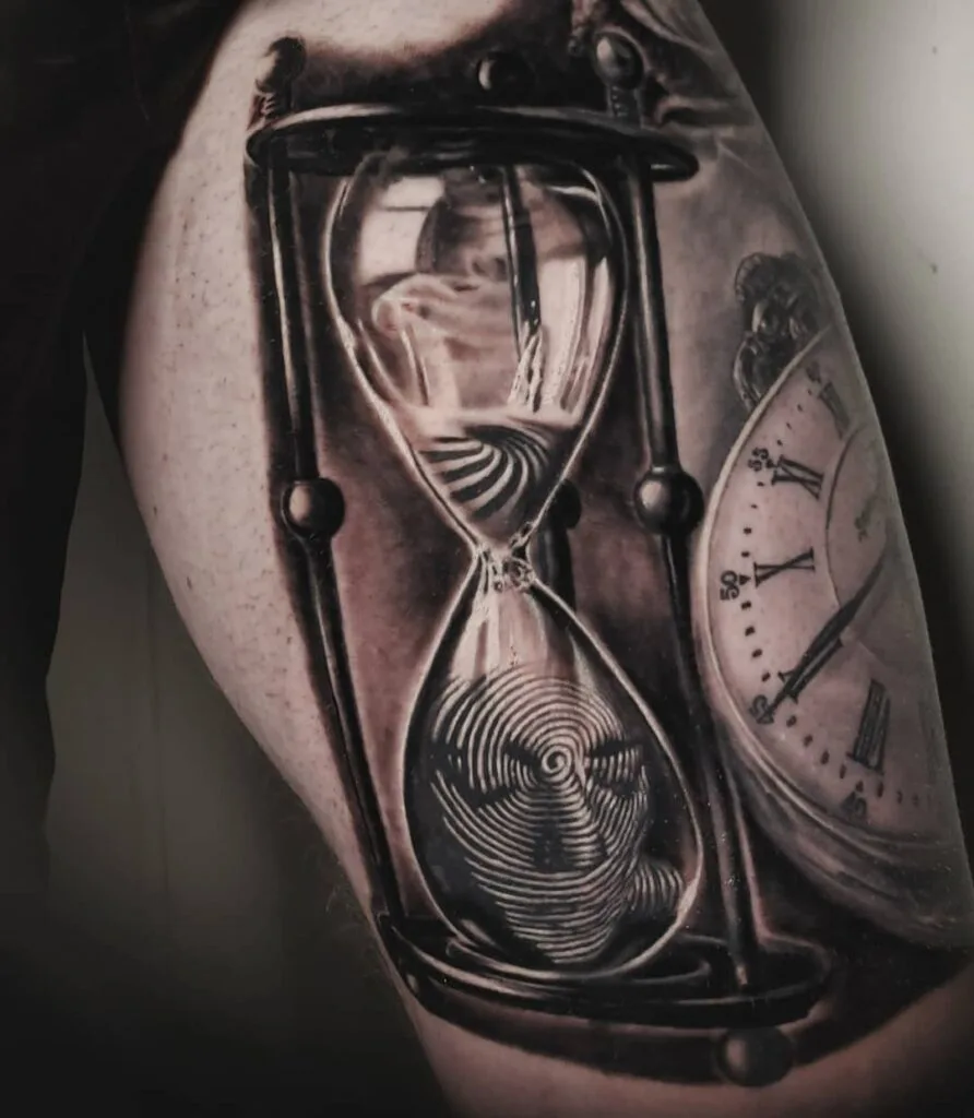 This mesmerizing hourglass tattoo features a fingerprint that forms a subtle human face, blending identity with the passing of time. The intricate fingerprint lines twist into facial features, symbolizing that time shapes who we are.