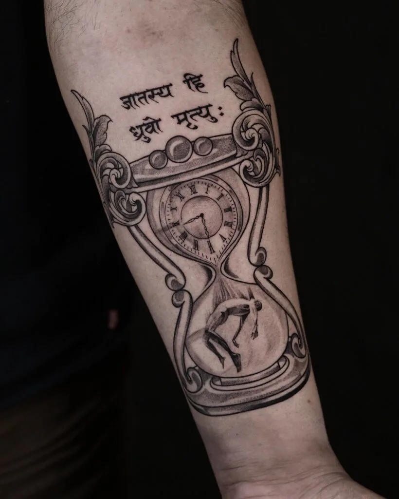 This profound hourglass tattoo features intricate ornamental details and a bold Sanskrit inscription at the top: “जातस्य हि ध्रुवो मृत्यु:” — meaning “The only certainty in life is death.” A classic clock face appears inside the upper part of the hourglass, symbolizing the relentless passage of time.
