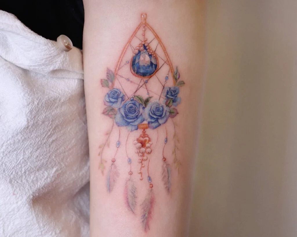 Blue Rose and Crystal Dreamcatcher Tattoo