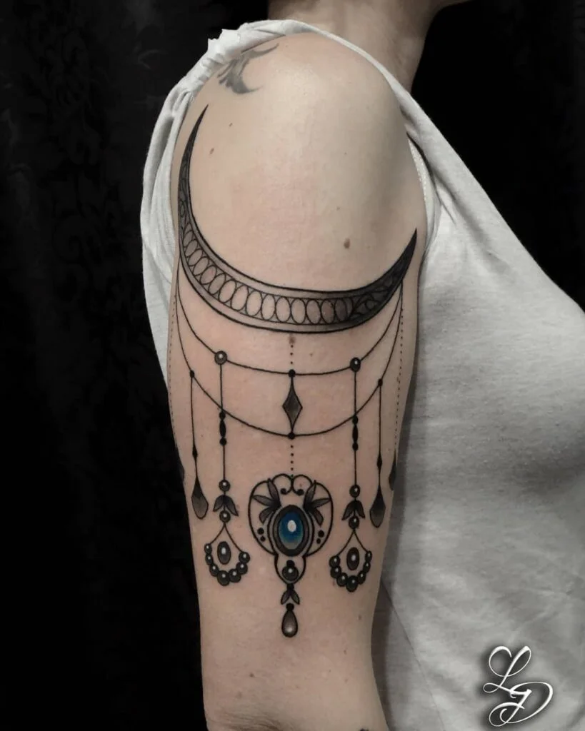 This upper arm tattoo features a bold crescent moon paired with elegant ornamental chains and jewel-like drops. The centerpiece is a blue gemstone-inspired detail, adding a pop of color to the striking black linework.