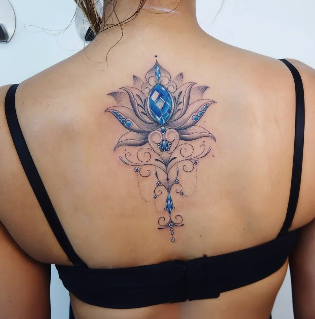 Elegant Blue Lotus Jewel Back Tattoo