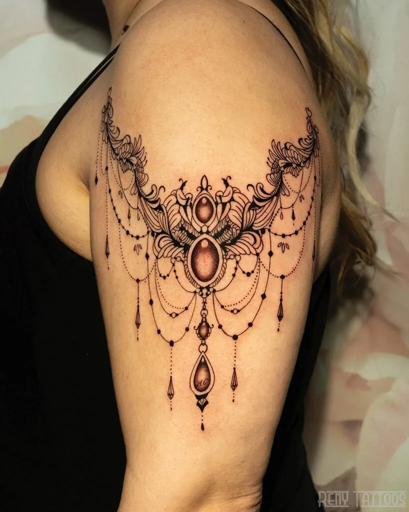 This stunning shoulder tattoo features an ornate arrangement of beads, chains, and intricate lace-like detailing that mimics fine jewelry.
