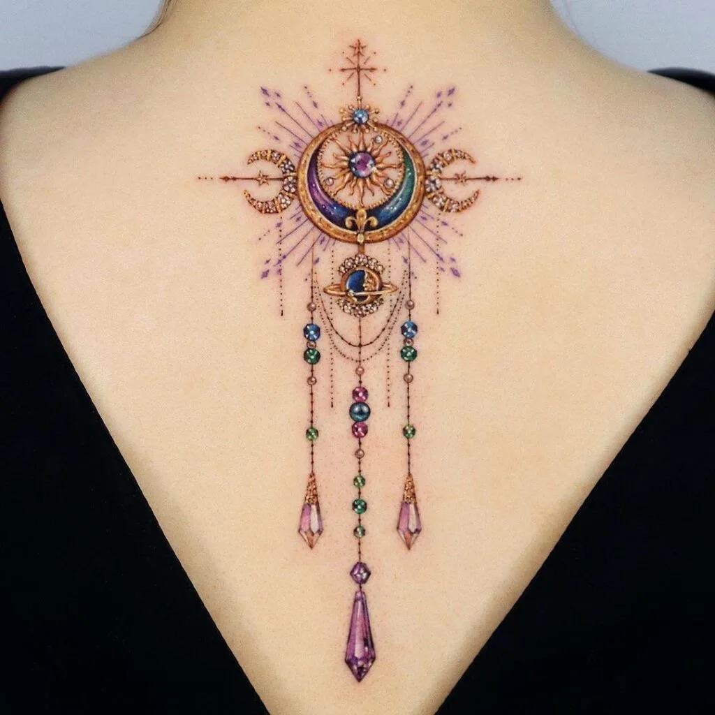 This radiant back tattoo features a golden crescent moon adorned with sparkling violet and ruby-toned gems. Suspended from the moon are intricate charms—tear-shaped crystals, stars, moons, and a radiant sun—all glimmering with fine detail.