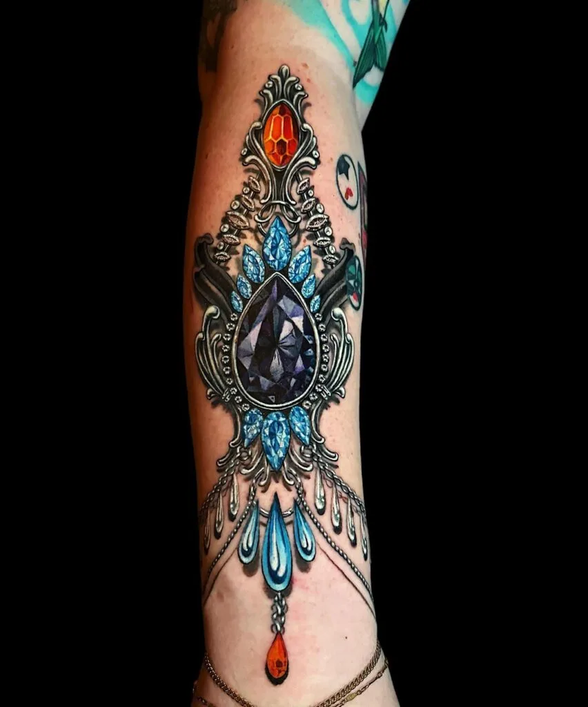 This breathtaking forearm tattoo features three radiant gemstones set within an intricate baroque frame. The gems—rendered in dazzling, multi-faceted detail—appear to catch and reflect light just like real diamonds.