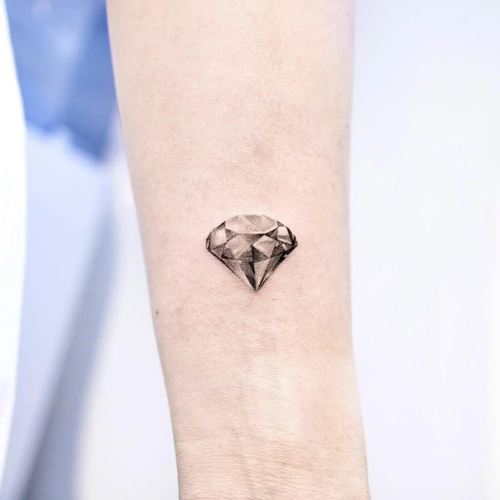 The tattoo’s small size and clean shape add to its modern, sleek appeal. Whether seen as a symbol of protection, growth, or elegance, this gem-inspired piece is perfect for anyone who appreciates bold simplicity with radiant detail.