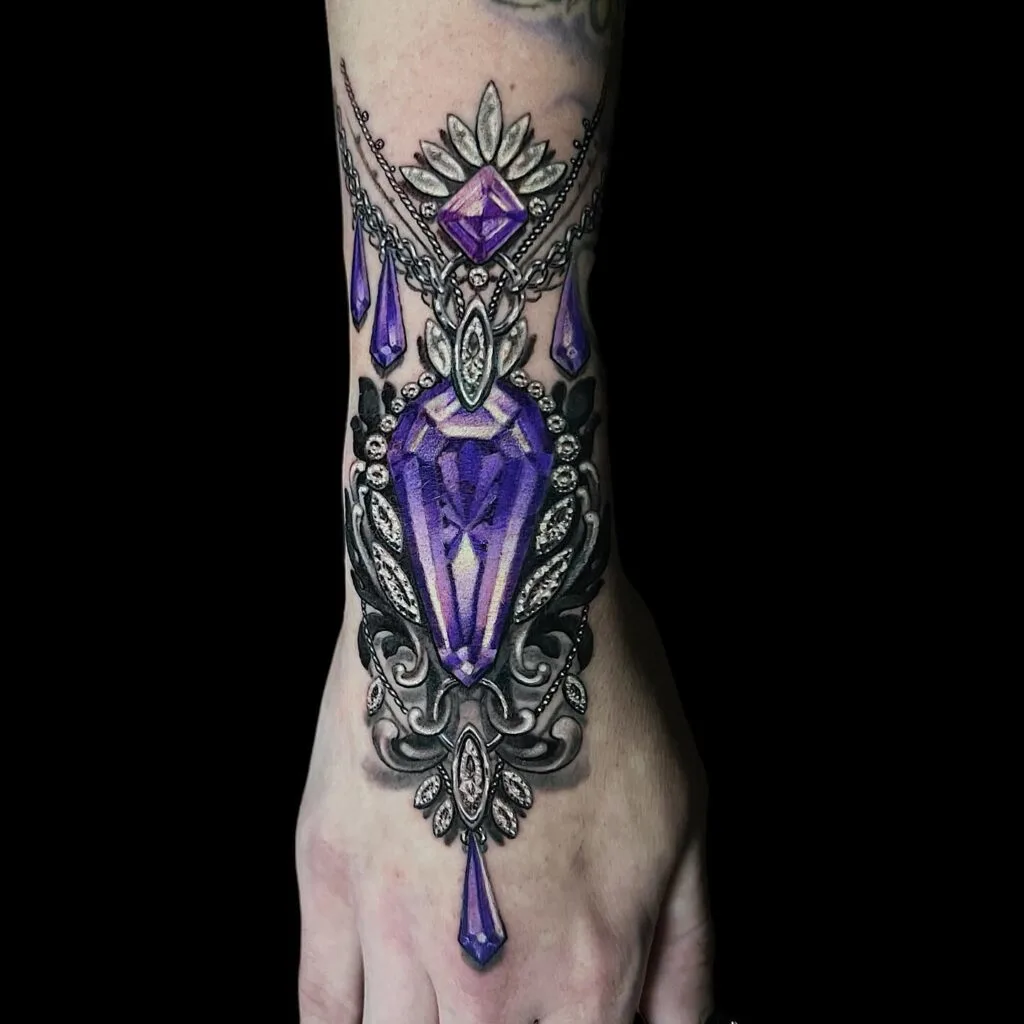 This dazzling wrist tattoo features a majestic purple gemstone centerpiece, masterfully detailed to mimic a faceted amethyst. Surrounded by elegant ornamental scrollwork and smaller radiant stones, the design evokes the grandeur of vintage royal jewelry.