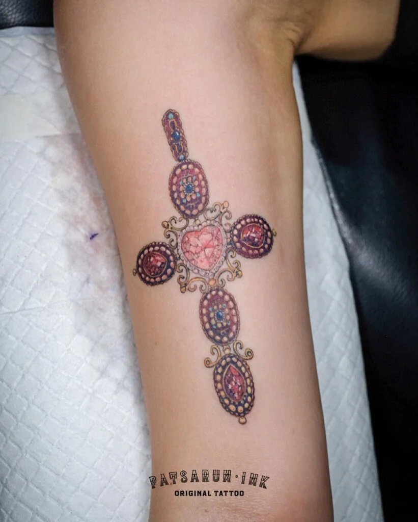 This beautifully detailed tattoo showcases an elegant cross made of gem-like ovals and a faceted heart at its center. Each segment appears encrusted with rubies, sapphires, and delicate golden accents, giving the piece the look of a jeweled artifact.