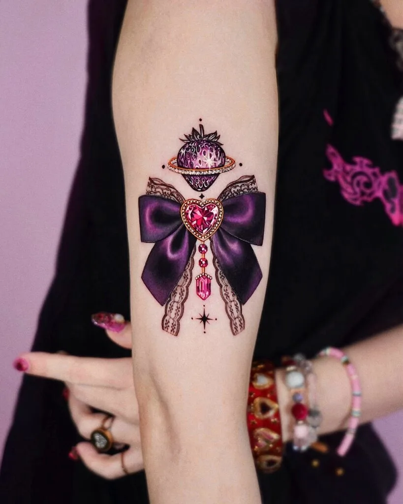 This enchanting forearm tattoo radiates elegance and fantasy. A large, deep purple satin bow anchors the design, centered by a heart-shaped pink gem encased in gold. Above it floats a glowing pink planet with crown-like spikes, suggesting royalty or otherworldly power.