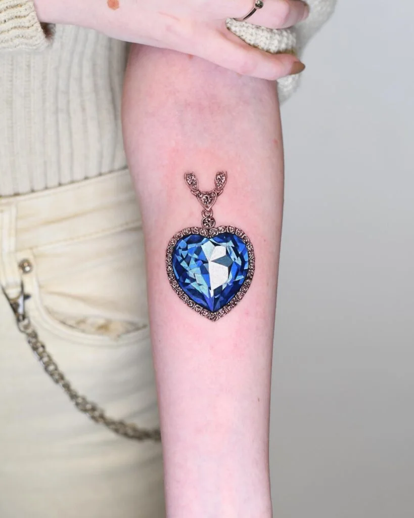 This stunning forearm tattoo features a vivid blue heart-shaped gemstone designed to resemble the iconic “Heart of the Ocean” necklace from Titanic.