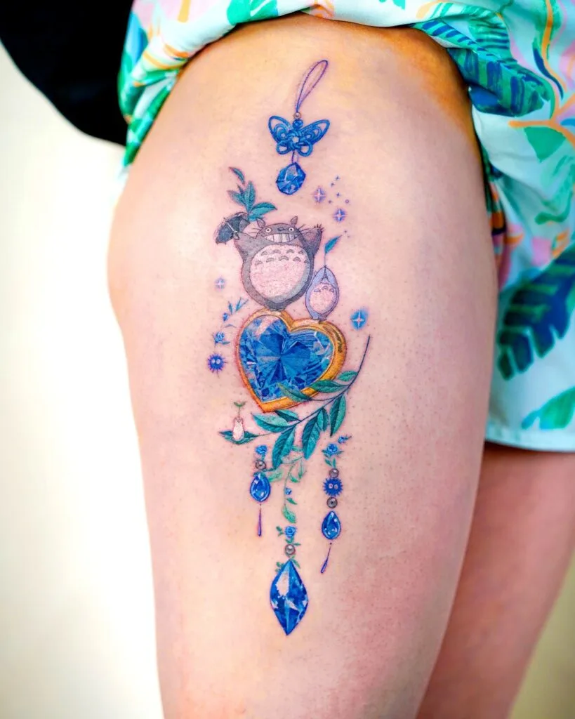 This whimsical thigh tattoo fuses anime charm with gem-studded elegance. At its heart is a sparkling blue heart-shaped jewel, wrapped in leaves and hanging ornaments. Above it, Totoro holds his iconic umbrella, surrounded by blue butterflies, stars, and mini companions.