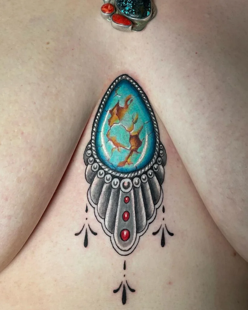 This bold sternum tattoo features a stunning turquoise gemstone with golden-brown marbling, set within a detailed silver frame. The teardrop-shaped jewel is accented with engraved metallic textures, red bead inlays, and ornamental blackwork that gives the piece a sacred, heirloom quality.