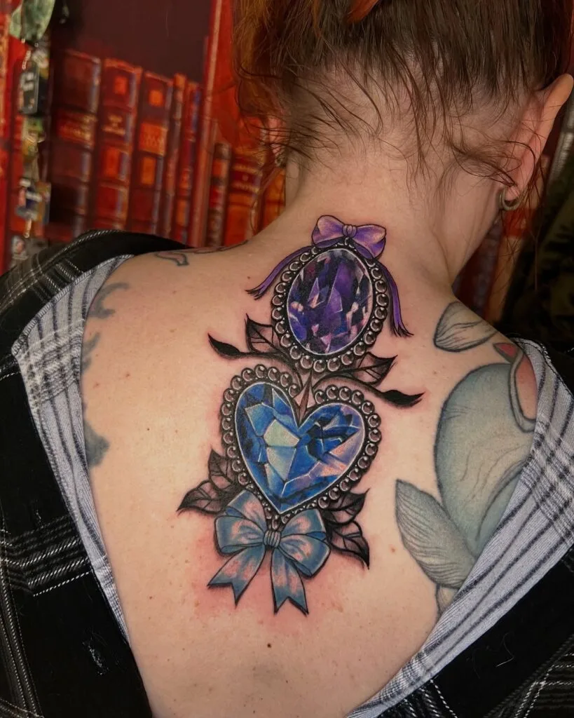 This back tattoo features two striking gemstones—an amethyst oval and a sapphire heart—each framed in ornate beaded settings. Decorative bows in purple and blue crown and anchor the gems, adding a playful, feminine charm.