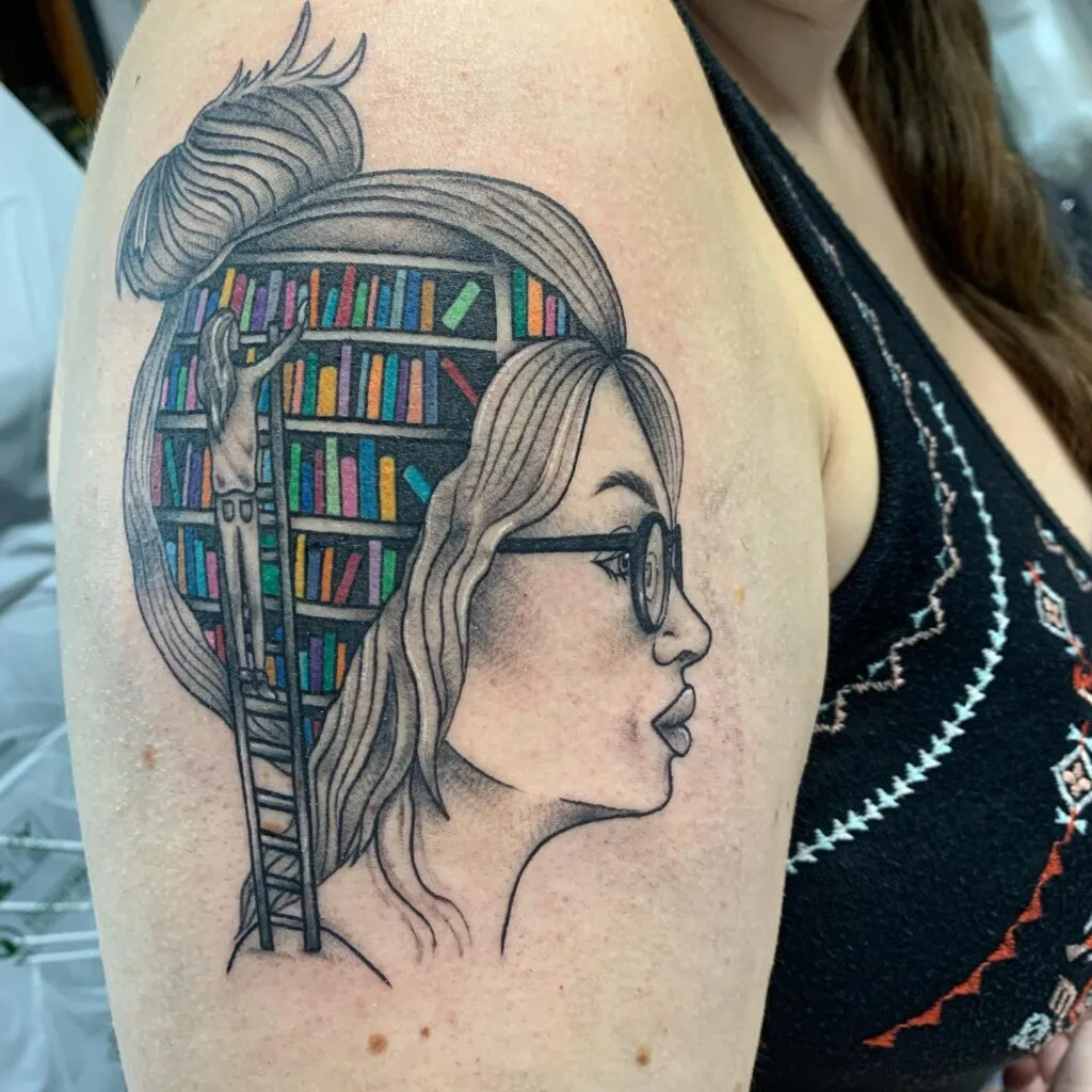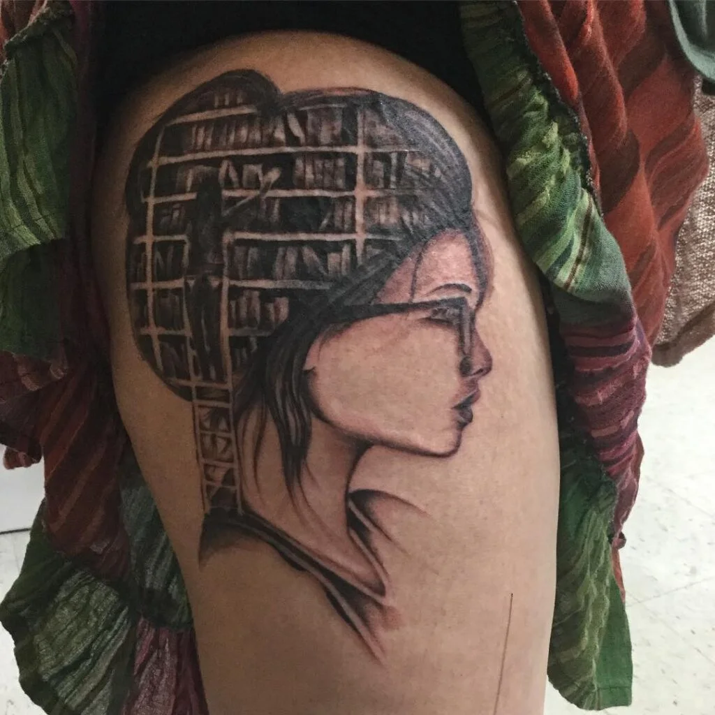 This tattoo features a side-profile portrait of a woman wearing glasses, with her hair transformed into shelves filled with books.