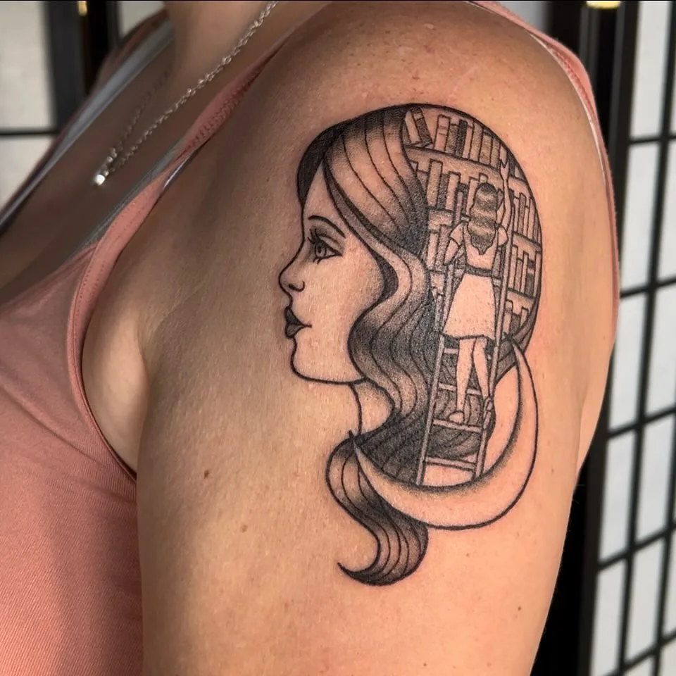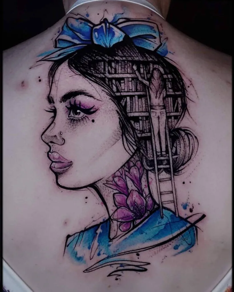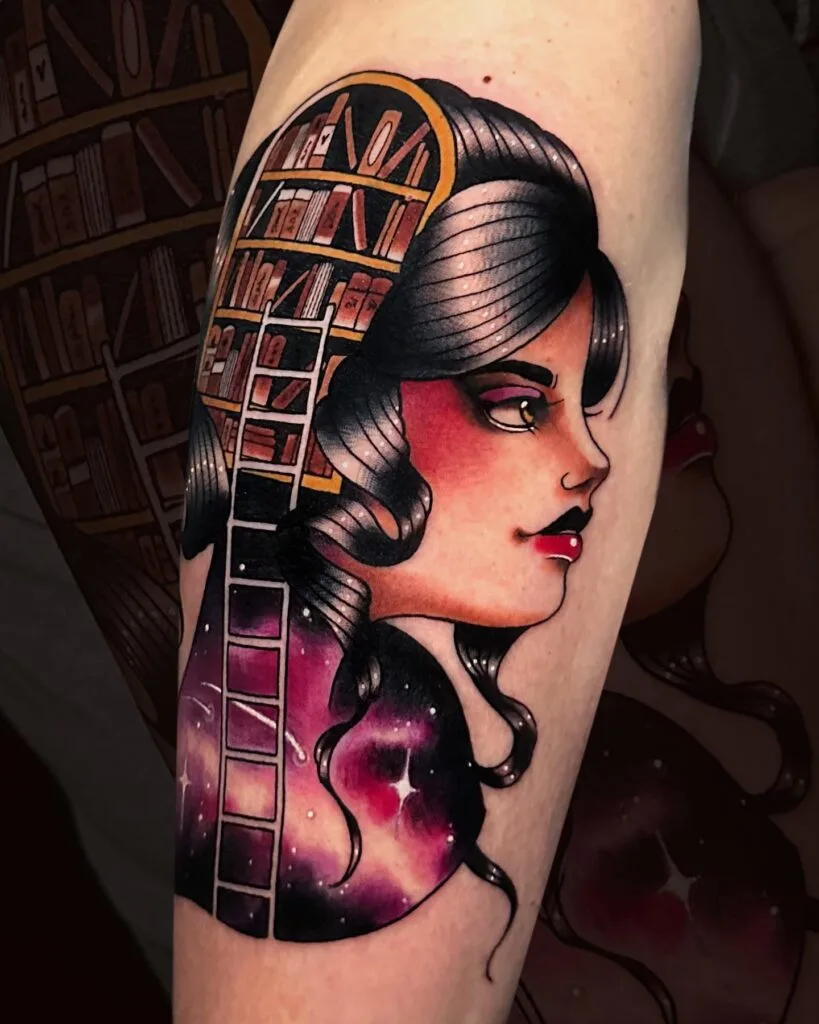 This bold tattoo blends portraiture with surreal design, featuring a woman whose hair transforms into arched bookshelves. A ladder runs through the shelves, symbolizing exploration, while the smooth black hair frames her striking profile.