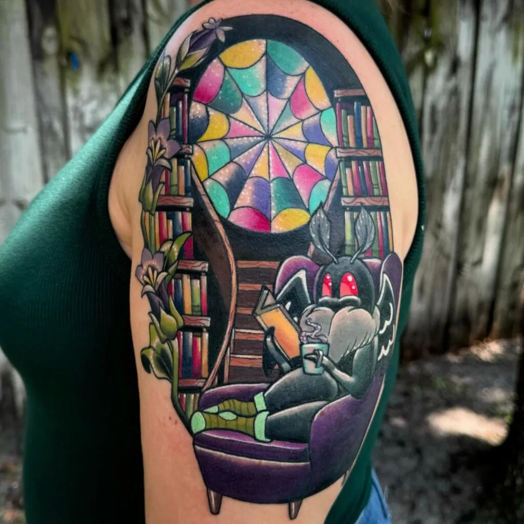 The tattoo blends playfulness with mystery, turning Mothman into a quirky book lover. It’s a vibrant, creative piece perfect for fans of folklore and reading.